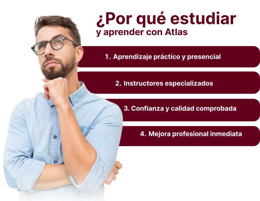 En Atlas Global Education ofrecemos cursos presenciales que combinan teoría y práctica, diseñados para estudiantes, profesionales y empresas que buscan desarrollar nuevas competencias. Impartidos por instructores especializados, nuestros programas permiten crecer profesionalmente, mejorar el perfil laboral y acceder a mejores oportunidades.